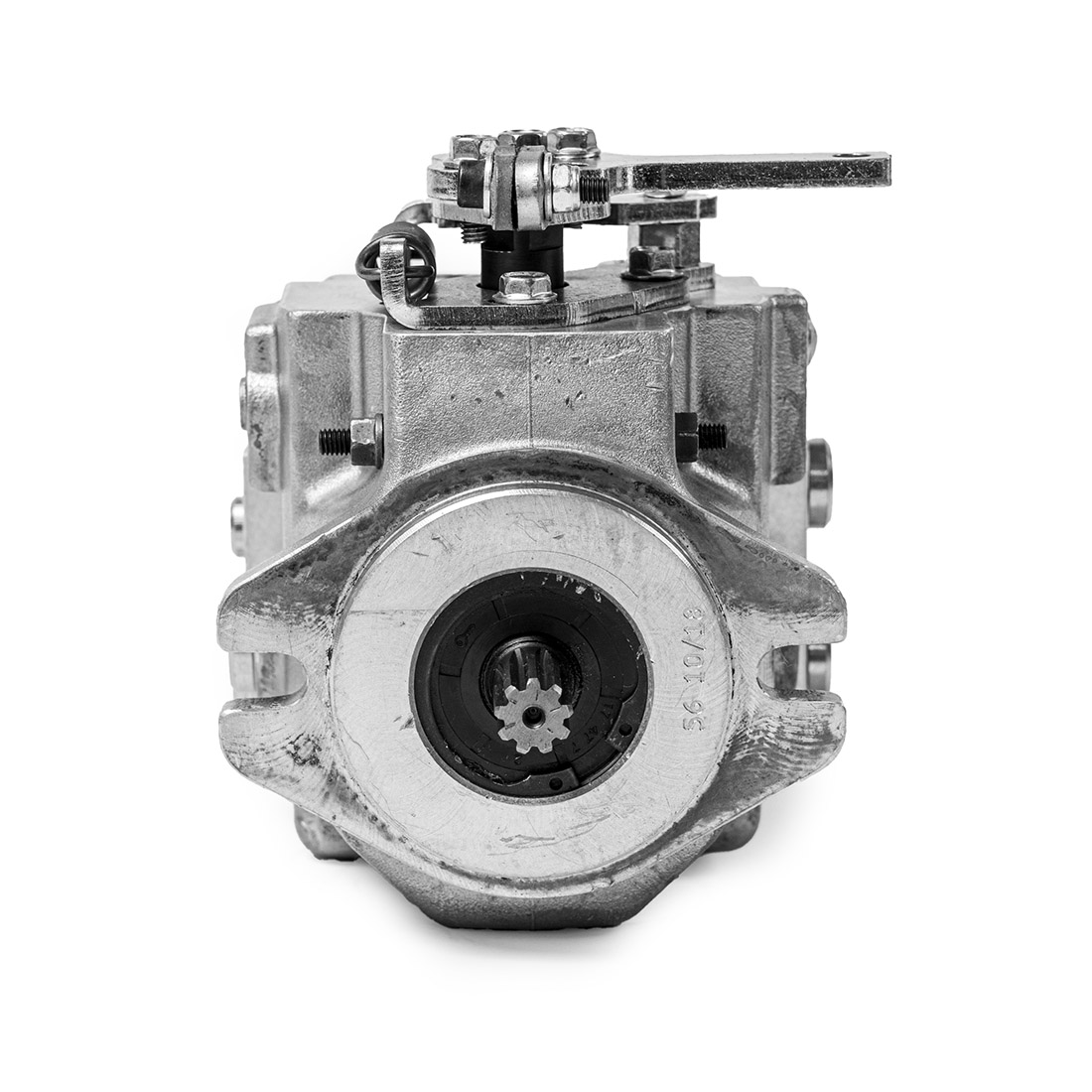 Displacement variation occurs through the rotation of a swash plate; by moving beyond the neutral point, flow reversal is achieved.