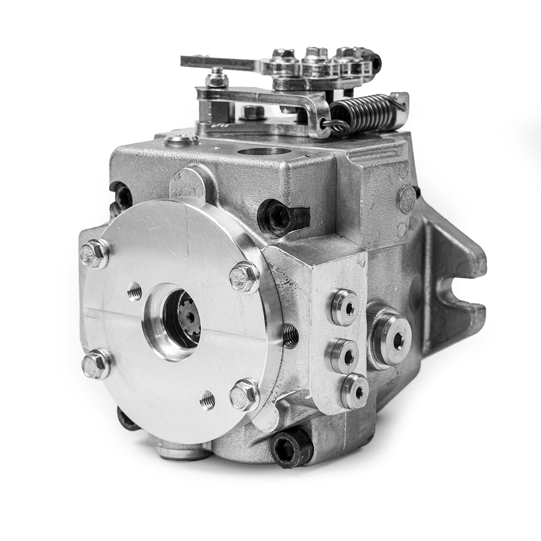 Displacement variation occurs through the rotation of a swash plate; by moving beyond the neutral point, flow reversal is achieved.